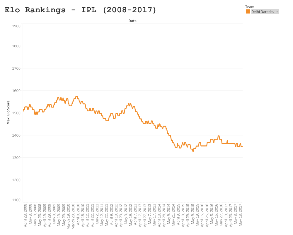 As team rosters vary from year to year so much, teams can struggle to pick up where they left off in relation to the prior season. Once such team who have continued to struggle in the IPL is the Delhi Daredevils (now known as the Capitals). Delhi has experienced minor peaks in Elo, such as semi final placings in 2012, but have been on average the worst performing and least consistent team since the IPL’s inception in 2008.
