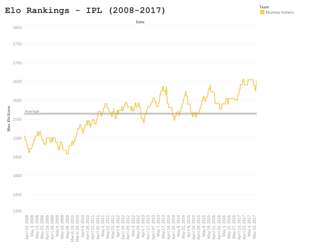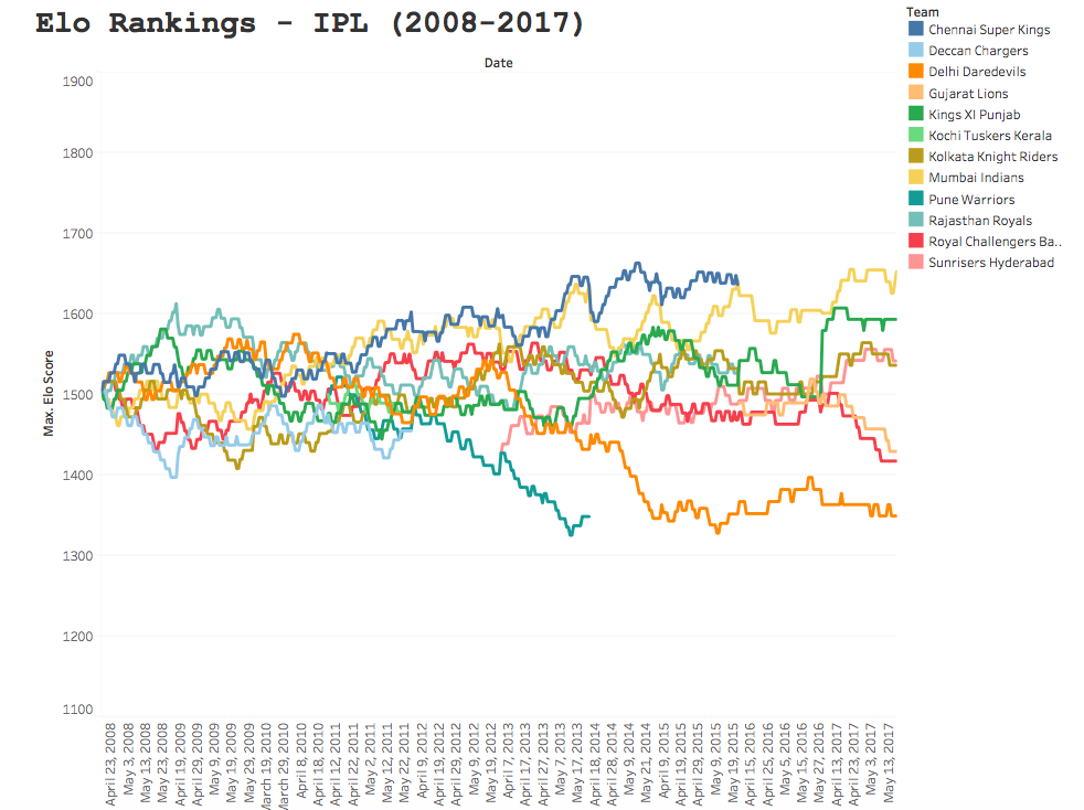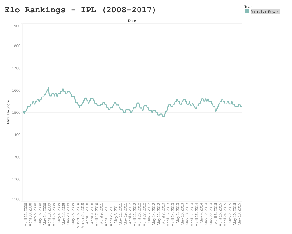 The Royals’ Elo ranking peaked after their winning season in 2008, at 1605.5 points. Since then they have reached the playoffs three times, but failed to make the final. Their seamless performance (no pun intended) in their winning season, can be seen by the steep gradient during the 2008 campaign; where they lost only three games. Sadly since then, Rajasthan have been somewhat of a yoyo team and struggled to find their feet.
