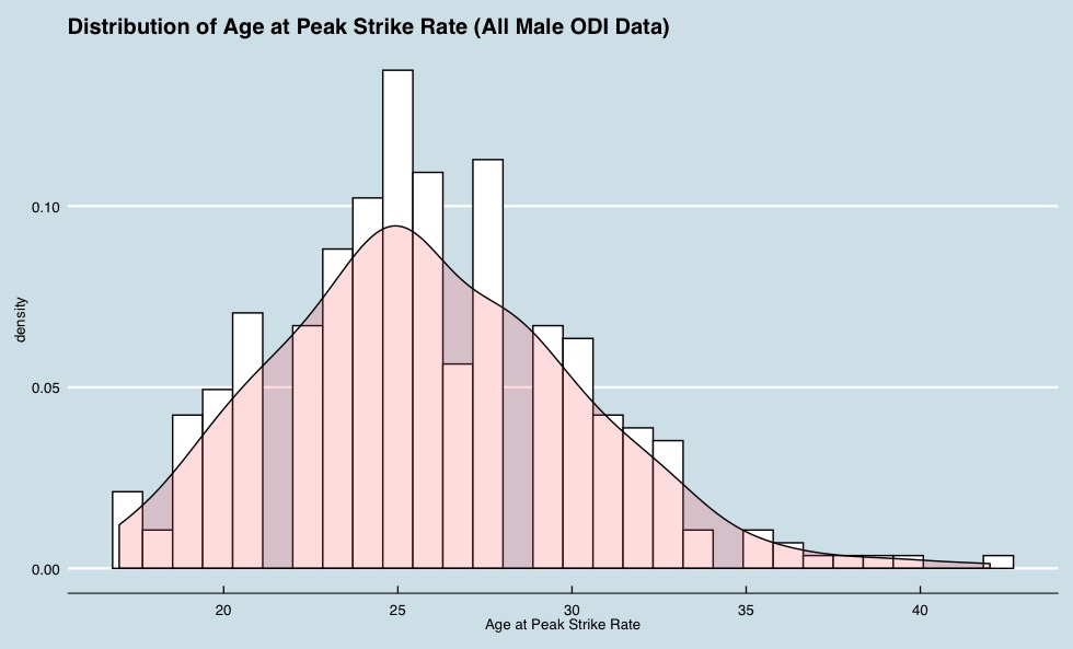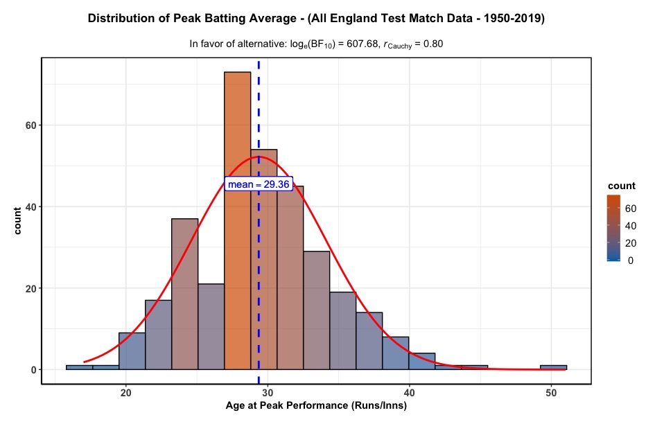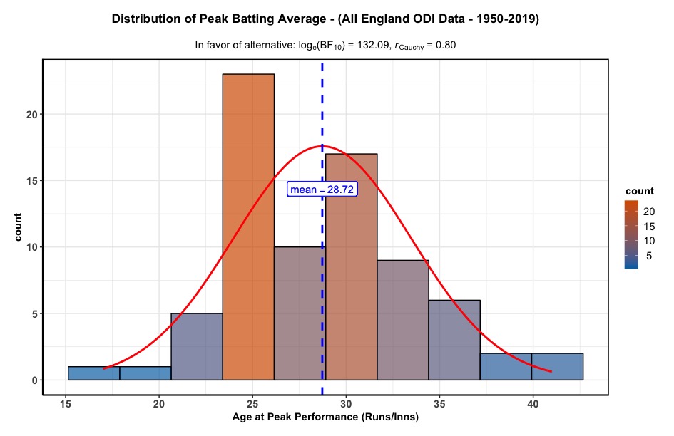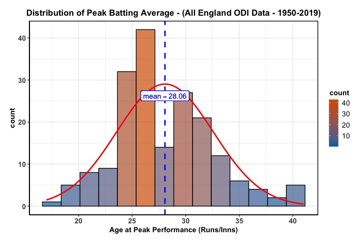 So, I’ve been developing a script to determine the average age of peak performance in cricket, using the ESPN Cricinfo API and with the help from a trusted colleague at the Beeb. I’ve provided an example above, which displays the distribution of age at peak performance for all English batsman in ODI cricket, that I could call from the API. The purpose of this work is to determine an average of when most athletes peak in cricket; which in turn has practical implications for recruitment and team management. In this case, peak performance is defined as the age when the batsman’s batting average (runs/innings) occurred. I have made the the code open source, as I am keen to see what people make of the logic, so please feel free to view what I have developed on Github, as I am always eager to update how this is simulated. The visuals are from ggstatsplot(), which is a beautiful statistical analysis package, which does the hard work in ggplot2 for you.
