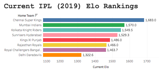 Hold fire, in weeks to come I’m going to begin to make predictions on the 2020 IPL campaign based off of these scores and any anecdotal information I can get from my fellow sports analysts. As well as that I’m going to perform correlative analysis between Elo scores and other predictors and/or ranking systems in t20 cricket. I hope you enjoy the Tableau dashboard.