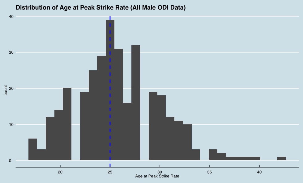 In weeks to come I’m going to post some findings from this analysis, and how peak performance for batting (and bowling) varies from nation to nation, as well as the potential to include other demographic segments. Hold tight.