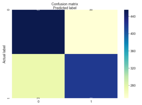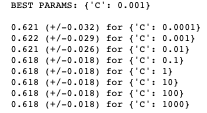 You can see that the recommended best input value for C is 0.001, indicating that we can achieve ~62% accuracy with a fairly high level of regularisation; which un-intuitively means a less “complex” fitting of the data.