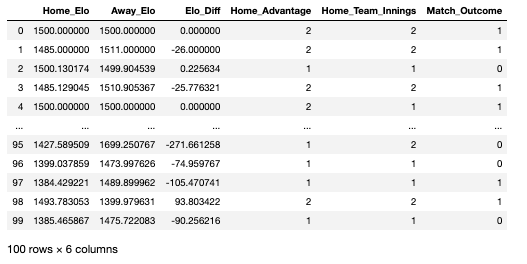 features = df[['Elo_Diff','Home_Elo', 'Away_Elo', 'Home_Advantage','Home_Team_Innings']].copy()